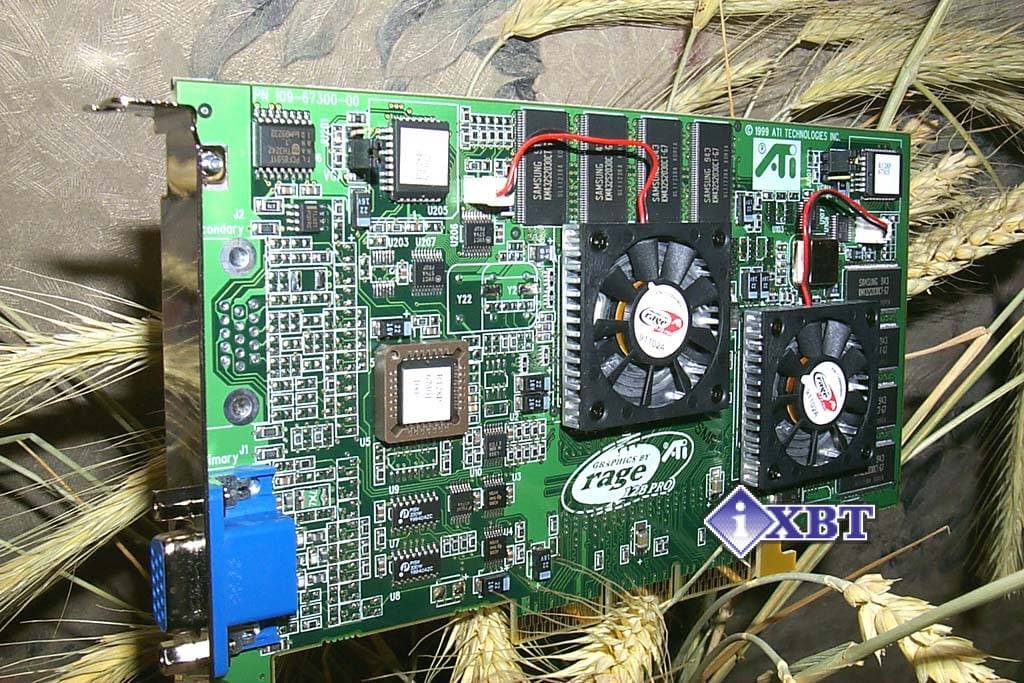 Перед тем, как более подробно рассказать о том, как это все работает, я познакомлю вас непосредственно с видеокартой ATI RAGE FURY MAXX. Как можно видеть из фотографии, это видеокарта имеет AGP 2x/4x интерфейс, на борту установлено два чипа ATI RAGE 128 PRO, каждый из которых имеет собственную видеопамять размером 32 мегабайта, то есть всего на карте размещено 64 мегабайта в восьми 7ns 64-мегабитных модулях. На печатной плате можно заметить наличие нескольких микросхем с BIOS, а также посадочное место под разъем для вывода на второй монитор.