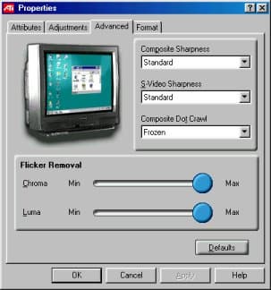Как я выше уже сказал, помимо самого чипсета на видеокарте установлен и чип ATI RAGE Theater. Этот процессор управляет выводом изображения на телевизор (на плате имеются разъемы S-Video и RCA), а также позволяет принимать видеопоток с аналогового входа (разъем RCA) и захватывать полноразмерное PAL или NTSC изображение.