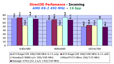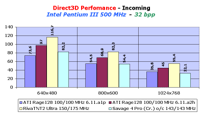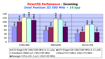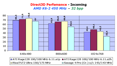 Зададим себе вопрос, а что же явилось причиной такого прироста? Изучив более подробно составляющие теста на 3D Mark99 MAX, мы даем ответ: существенно увеличена скорость работы чипсета Rage128 при операциях с одиночными текстурами (тест Game1), а также выросли показатели скорости рендеринга одной текстуры, но разного размера. Мы можем уже себе представить, как возрастет скорость в играх, не использующих мультитекстурирование (типа Incoming).