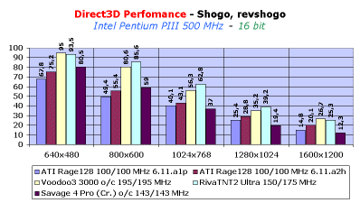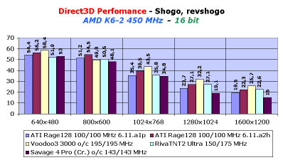 Далее, рассмотрим игру Shogo, где есть два режима работы: с мультитекстурированием и без него. Скорость работы Rage128 при включенном режиме мультитекстурирования почти не изменилась, поэтому мы не будем заострять на этом режиме внимания. А вот при работе Rage128 в обычном двухконвейерном режиме (обработка двух пикселей за такт, но только накладывается одна текстура) также произошло некоторое ускорение работы чипсета: