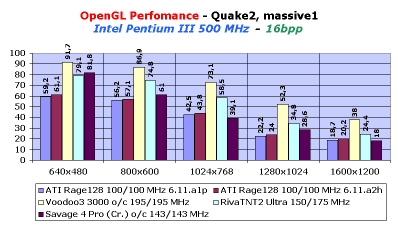 Теперь посмотрим, что же изменилось в работе API OpenGL. Изменения есть, но они не столь революционны по сравнению с Direct3D. Сразу же скажу, что драйвер OpenGL, входящий в состав драйверов 6.11.A2H, вообще почти не дал прироста в скорости. Только драйвер, поставляемый в версии GL1220 (оптимизированный под Quake3), дал положительный эффект. Для чего пришлось файл ati9xaa.dll этой версии скопировать поверх аналогичного файла версии 6.11.A2H. В результате прирост в разных режимах от 2 до 4 fps имеется, но он не дает кардинальной смены общей картины. Хотя должен отметить практическое равенство Rage128 и RivaTNT2 Ultra на системе К6-2 при 32-битном цвете. Ниже мы приводим диаграмы для наглядности.