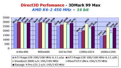 На системе Pentium III видим, что Rage128 также почти догоняет RivaTNT2 Ultra (150/175 MHz), а на К6-2 даже обгоняет ее.