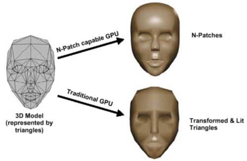 В тоже время, треугольные сегменты (N-Patches), используемые в технологии TRUFORM, избавляют нас ото всех (!) ранее перечисленных недостатков. Ну, а некоторые из них волшебным образом превращаются в достоинства:
