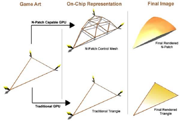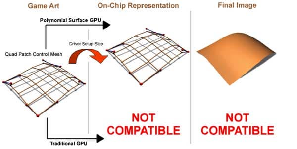 - Фактически придется иметь две версии описания мира и моделей в игре — заданные в виде кривых для ускорителей, которые поддерживают аппаратную тесселяцию, и в виде прямых для тех, которые не поддерживают. В DirectX 8 программная эмуляция этой функции недоступна.