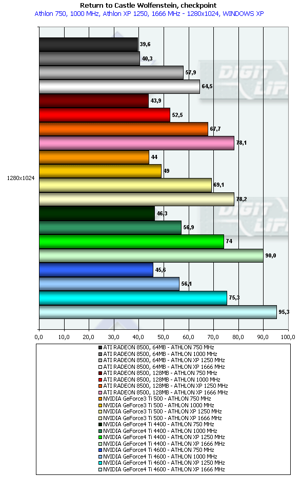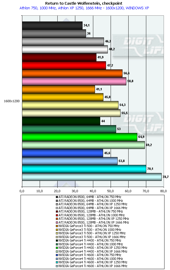 А это разрешение сдвинуло "планку" с частоты 1250 на 1000 МГц, то есть, процессор AthlonXP 1250 MHz еще способен хоть как-то показать, что Ti 4600 — самая быстрая карта :-).