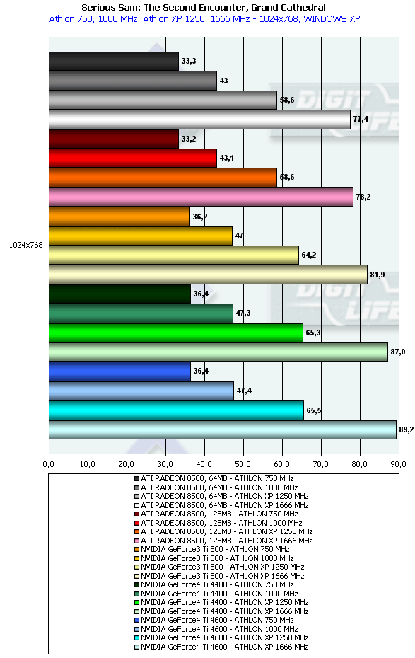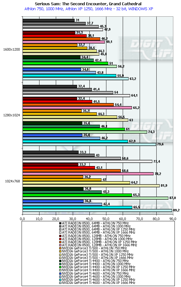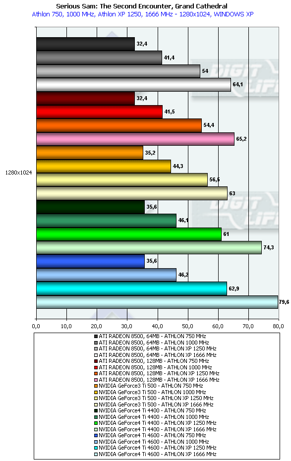 Наглядно видно, как сильно зависит от процессора данная игра в этом разрешении. За падение производительности у разных карт практически полностью отвечает частота CPU и платформа. То есть, карты настолько сильны, что даже 1666 МГц у AthlonXP не может раскрыть потенциал всех акселераторов.