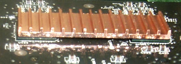 Как можно видеть, радиаторы на микросхемах памяти представляют собой два комплекта: большой и малый. Большой комплект — это два игольчатых радиатора (точно такой же формы, как и у карт от Gainward, которые мы уже рассматривали). Малый комплект состоит также из пары пластинчатых радиаторов. Каждый из радиаторов "покрывает" собой две микросхемы памяти. Хочу заметить, что у модулей памяти, что расположены на лицевой стороне карты, есть явное преимущество в охлаждении, ведь и радиаторы более высокие, и они обдуваются воздухом из центрального кулера. Поэтому для тех, кто хочет карты разгонять, я рекомендую обязательно ставить дополнительное охлаждение.