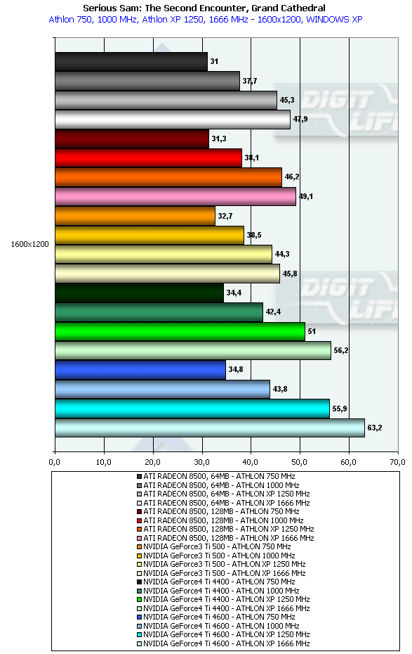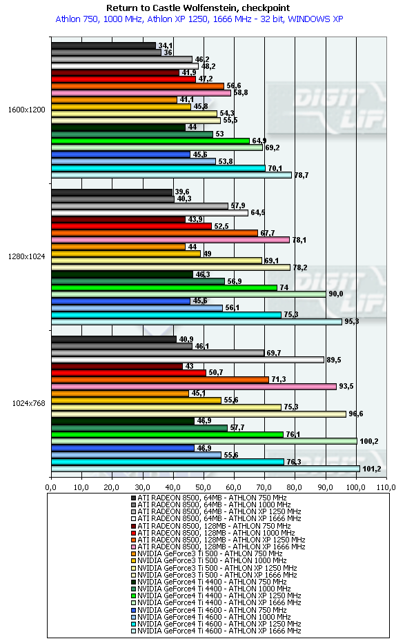 Как можно видеть, влияние процессора в этом разрешении очень велико, уже даже 1250 МГц становятся для Ti 4600 "бутылочным горлышком" (разницы между Ti 500/Ti 4400/Ti 4600 практически нет). Только карты от ATI показывают чуть меньшую производительность и на младших процессорах.