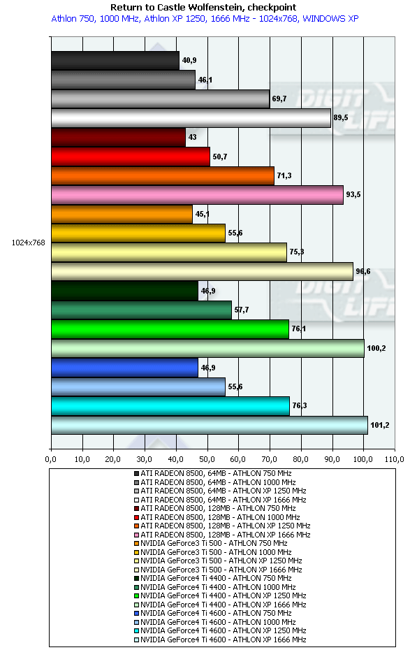 - Return to Castle Wolfenstein (MultiPlayer) (id Software/Activision) — OpenGL, мультитекстурирование, Checkpoint-demo, настройки тестирования — все на максимально возможном уровне, S3TC OFF, конфигурации можно скачать тут;