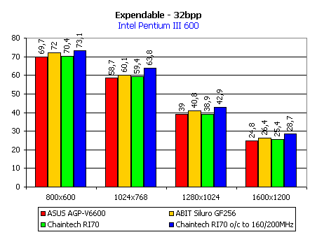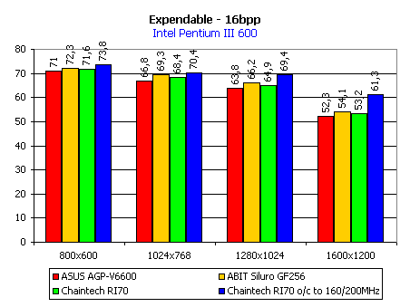 Этих инструментов вполне достаточно для того, чтобы показать производительность видеокарты. Для наглядности на диаграммах приведены скоростные показатели еще двух видеокарт на GeForce 256 с памятью типа SDR SDRAM: ASUS AGP-V6600 и ABIT Siluro GF256. Также, на этих же диаграммах мы покажем работу видеокарты Chaintech Desperado RI70 при разгоне.