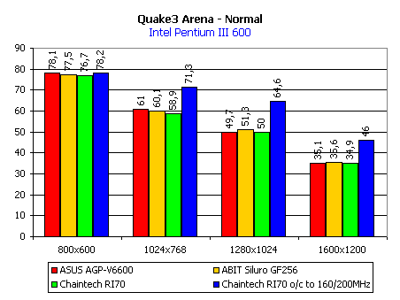 Как можно видеть, скорость видеокарты Chaintech Desperado RI70 мало отличается от производительности аналогов, чего и следовало ожидать от платы, полностью сделанной на основе reference-дизайна. А вот работа на разогнанных частотах выделяется. Прирост по скорости весьма существенный, особенно это заметно в игре Quake3. Тем не менее, более разгоняемые карты, в частности ASUS AGP-V6600 и Leadtek WinFast GeForce256, при оверклокинге показывают еще более значительный прирост.