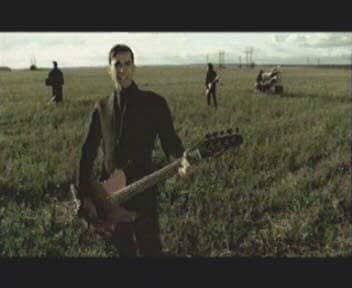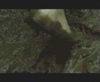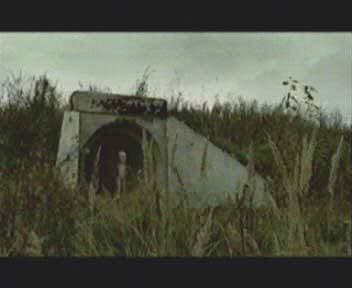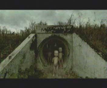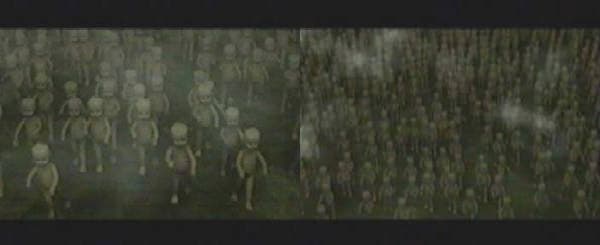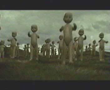 3-мерные модели кукол были воссозданы мной в 3Dstudio MAX по образу и подобию настоящих кукол, отснятых в видеоклипе, затем были специально отсняты на камеру и оцифрованы крупные части тел у кукол для последующего использования этих материалов в качестве текстур. Для кукол была создана гордая и страшная походка типа "Zomby", которой они и прошли через весь клип :). На картинке видно, что куклы наполовину скрыты травой и постепенно выходят на вершину холма, на видео в этот момент трава на переднем плане колышется под действием порывов ветра, и загораживает кукол стебельками. Создание такого эффекта в данном кадре было выполнено даже проще, чем может показаться — если вы обратили внимание, в кадре свет падает таким образом, что небо имеет ярко выраженный светлый оттенок, в то время, как земля и трава, напротив очень темны. Я просто использовал ту же последовательность кадров в качестве маски прозрачности для кукол, просто немного увеличив контрастность видеоряда, а затем использовав эту анимированную маску в AfterEffect для получения необходимого результата.