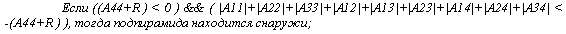 то заведомо таких точек не существует, а знак коэффициента A44 различает расположение подпирамиды внутри или снаружи по отношению к поверхности квадрики Q=0 (если A44 >= 0, тогда подпирамида внутри квадрики). На основании результатов этого теста осуществляется деление подпирамид, которые лежат внутри квадрики целиком или, возможно, частично, а заведомо внешние подпирамиды исключаются из обработки. Тест на пересечение подпирамид со свободными формами несколько отличается, а модификация остается прежней и для базовой квадрики и для функции возмущения. Для базовой квадрики тест на пересечение выглядит следующим образом: