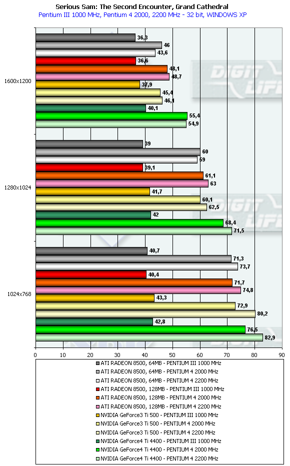 Вот тут ситуация более разнородная, и, хотя Ti 4400 в лидерах, как и положено, но "в затылок" ему дышит карта на базе RADEON 8500 128MB.