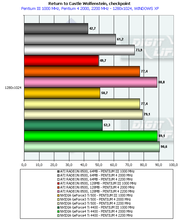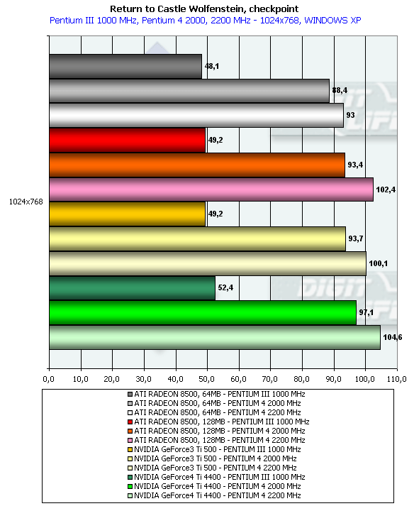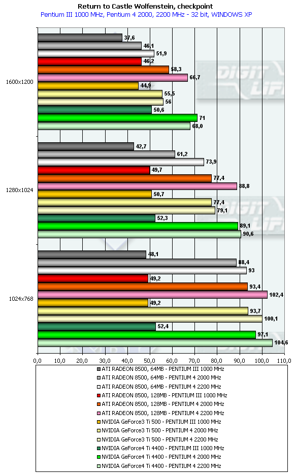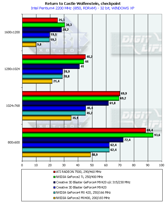 - Return to Castle Wolfenstein (MultiPlayer) (id Software/Activision) — OpenGL, мультитекстурирование, Checkpoint-demo, настройки тестирования — все на максимально возможном уровне, S3TC OFF, конфигурации можно скачать тут;