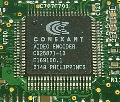 На модулях памяти, как я уже сказал выше, радиаторов не установлено, зато на обороте платы можно найти процессор от Conexant, отвечающий за TV-out (хотя по спецификациям GeForce4 Ti можно понять, что GPU уже внутри себя несут все компоненты, отвечающие за TV-out).