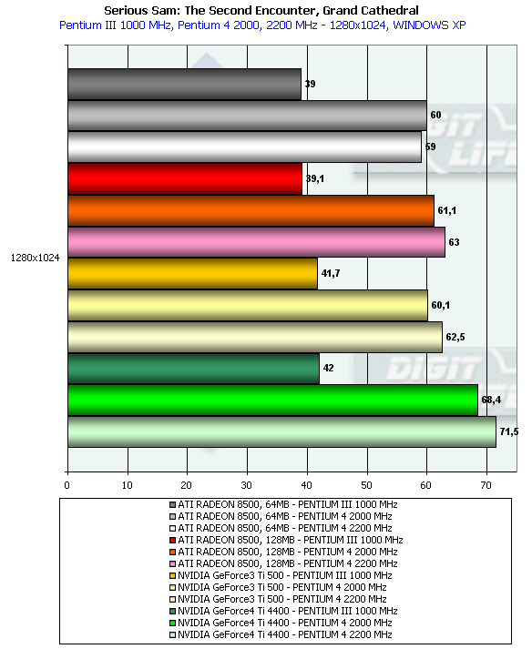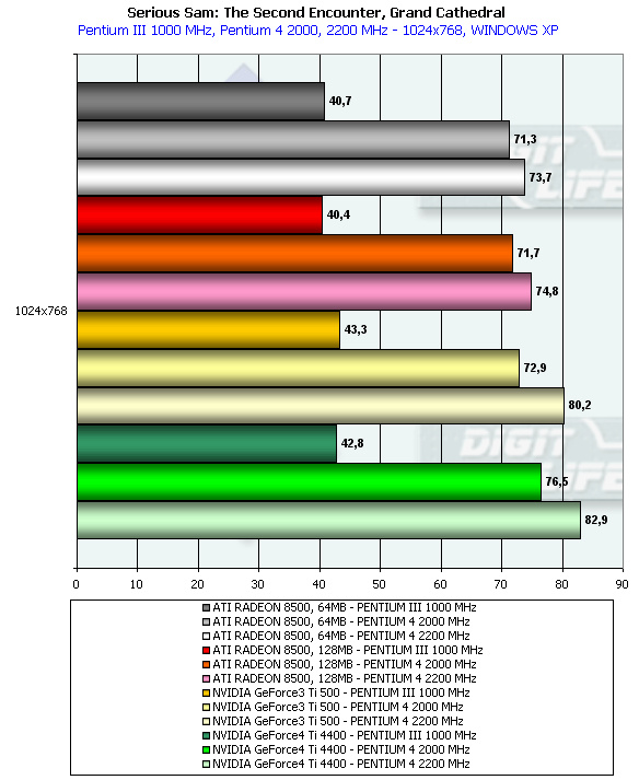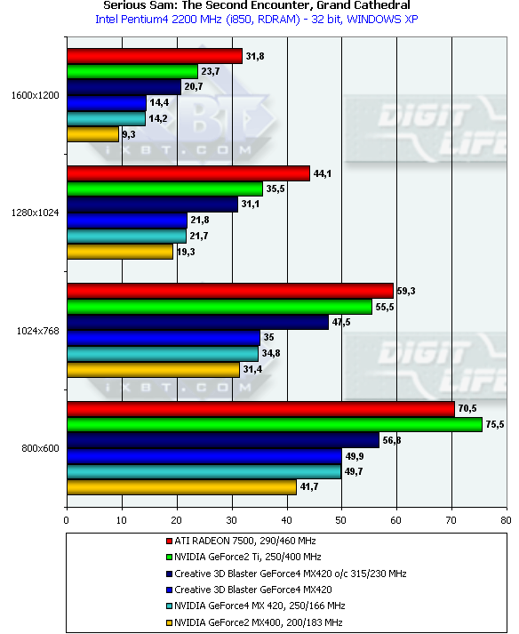 - Serious Sam: The Second Encounter v.1.05 (Croteam/GodGames) — OpenGL, мультитекстурирование, Grand Cathedral demo, настройки тестирования: quality, S3TC OFF, Trilinear;