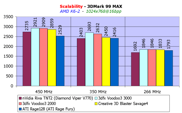 А вот посмотрев на диаграмму масштабируемости, то есть на зависимость производительности видеокарты от частоты работы процессора можно сказать, что по скорости в K6-2 системах Creative 3D Blaster Savage4 стоит на 2-м месте после Voodoo3: