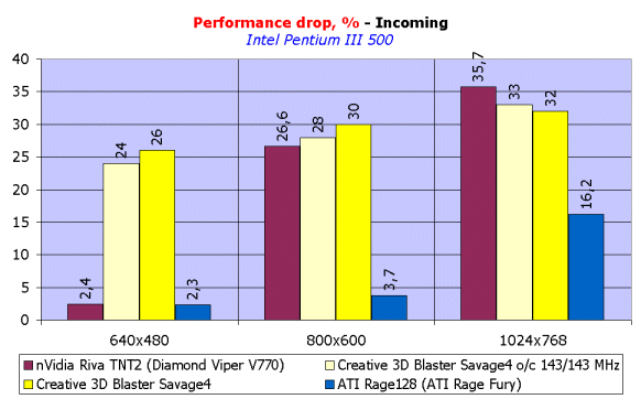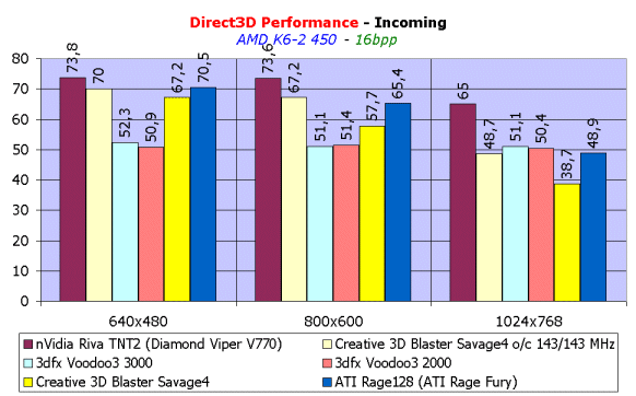 Популярнейший инструмент для измерения производительности видеокарт в Direct3D — игру Incoming мы, конечно же, тоже не забыли. Тем более, что это практически единственный продукт, который может дать более-менее объективную оценку падения производительности при переходе с 16- на 32-битный цвет. К сожалению, Incoming поддерживает только 3 разрешения. Ниже приводится результаты в 16- и 32-битном цвете: