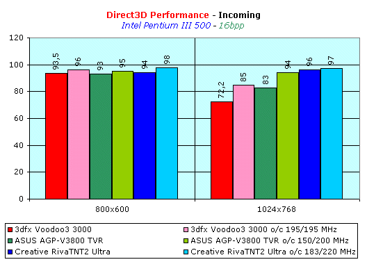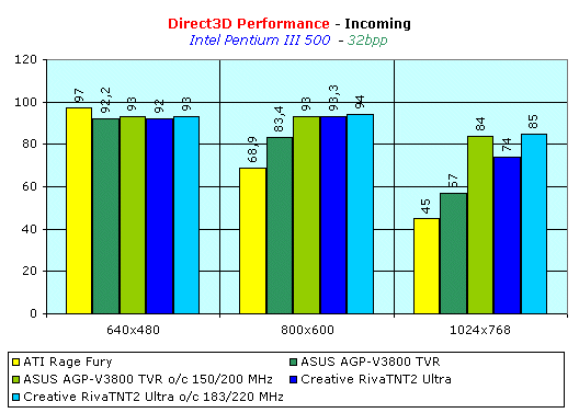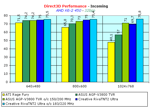 - Incoming — это реальная игровая программа, которая использует максимально большое число 3D-функций (за исключением мультитекстурирования) в Direct3D, вследствие чего мы наблюдаем работу акселератора в тяжелых сценах. Также в этой программе грамотно продуман инструмент замера FPS (frames per second).