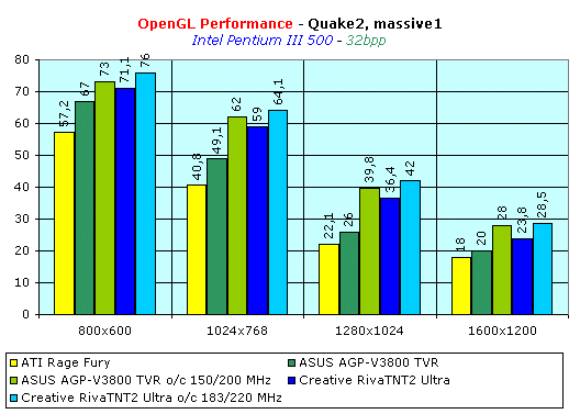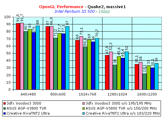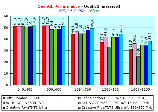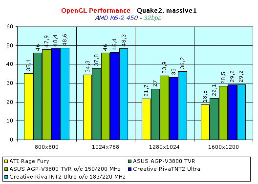 - Quake2 — уже традиционный способ измерения производительности карты в OpenGL. Используется версия 3.20, демо massive1.dm2.
