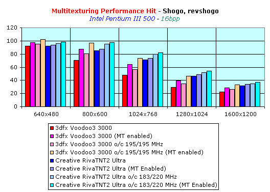 Но на этом тестирование еще не закончено. Я не зря отметил выше, что игра Shogo поддерживает режим мультитекстурирования. А на этом режиме, как известно, сильно выигрывает 3dfx Voodoo3. Поэтому мы испытали и nVidia Riva TNT2 Ultra, и 3dfx Voodoo3 3000 в этом режиме. Ниже представлены результаты (разрешение 1024х768х16, процессор Intel Pentium III 500 MHz).