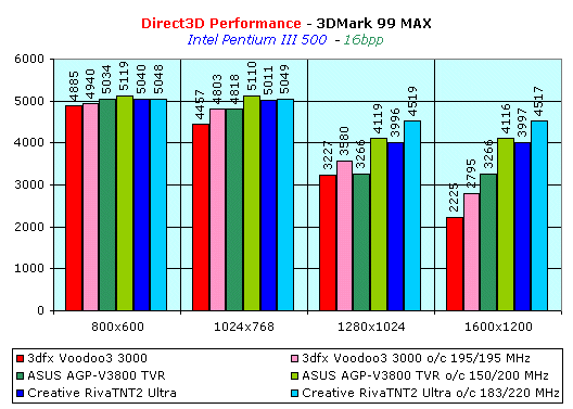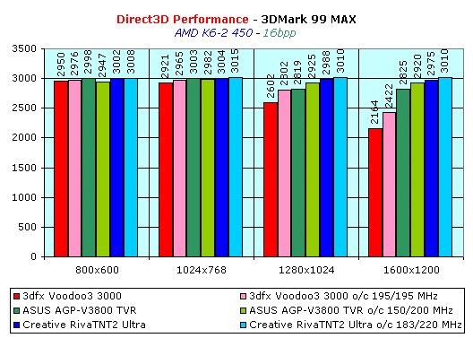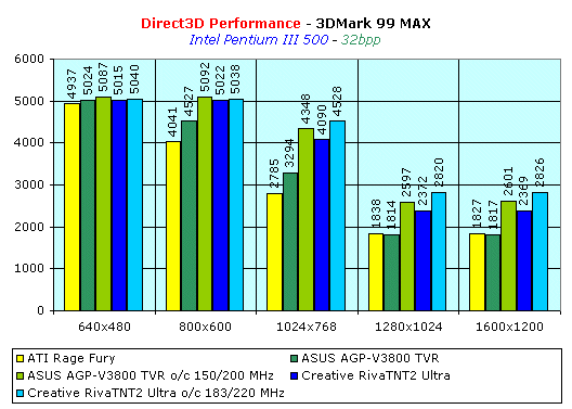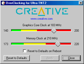 В заключении рассказа об установке Creative 3D Blaster Riva TNT2 Ultra хочу сказать, что тестирование проводилось на драйверах nVidia 1.88, версия BIOS — 2.05.2.11 от 5 мая 1999 года. Опытным путем был достигнут тот максимальный разгон, при котром видеокарта работает устойчиво — 183 МГц на чипсете, 220 МГц - на памяти. Напомню, что по умолчанию частоты установлены как 150 и 183 МГц соответственно. Поэтому тестирование для этой платы проводилось дважды: для номинального режима и режима максимального разгона.