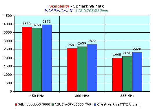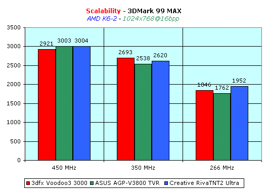 И в конце рассмотрения скоростных показателей по 3D мы приведем диаграмму зависимости производительности видеокарт от частоты центрального процессора (3D Mark99 MAX, 1024x768x16):