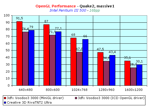 Что мы можем сказать по этим данным? Видим явный выигрыш nVidia Riva TNT2 Ultra практически во всех режимах Direct3D на системах Pentium III и К6-2. Что же касается OpenGL, то здесь история весьма примечательная. Первоначально, когда тестирование проводилось на драйверах версии 1.73, почти везде (и на Pentium III, и на K6-2) одержала победу плата 3dfx Voodoo3 3000 (тестирование проводилось на мини-драйвере версии 1.48). Но в драйверах версии 1.88 появилась поддержка 3Dnow!, вследствие чего на K6-2-системе вышли вперед карты на базе nVidia Riva TNT2, причем не только Ultra, но и обычные. Это дает nVidia Riva TNT2 несомненный плюс. Также хочу отметить и несколько возросшую скорость в OpenGL и на Pentium III-системе, хотя не в такой мере. Тем не менее, говорить о беспрекословном лидерстве 3dfx Voodoo3 3000 в OpenGL уже не приходится. Но это еще не все. Не так давно 3dfx выпустила новые драйвера для 3dfx Voodoo3, включающие в себя ICD OpenGL (для полноценной работы новой игры Quake3). Так вот, после тестирования 3dfx Voodoo3 3000 на этих драйверах выявилось значительное падение в скорости, по сравнению с мини-драйвером. Ниже представлена диаграмма результатов по Quake2 в 16-битном цвете, где данные по 3dfx Voodoo3 3000 получены на ICD OpenGL.