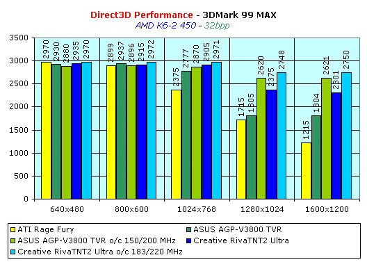Вот, где триумф nVidia Riva TNT2 Ultra! На диаграммах видно, что лидерство бесспорно. Даже более дешевая карта на nVidia Riva TNT2 легко обходит Rage128. Однако давайте посмотрим более внимательно на результаты. Чем характерен 32-битный цвет с точки зрения его недостатков? Тем, что он подчас резко снижает производительность акселератора. Но здесь результаты несколько ошеломляют. Если на неразогнанных картах на базе Riva TNT2 падение составляет до 30% (что немного меньше, чем у обычной nVidia Riva TNT — 42%), то на разогнанных оно гораздо больше.