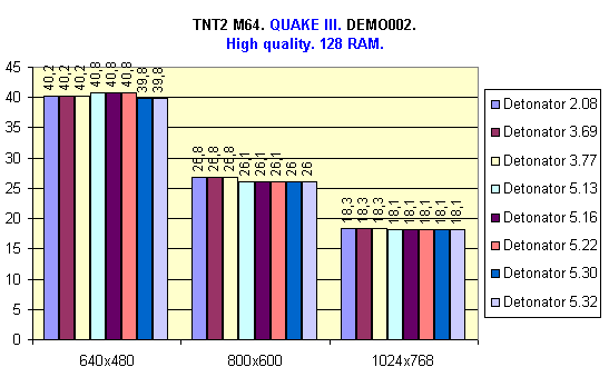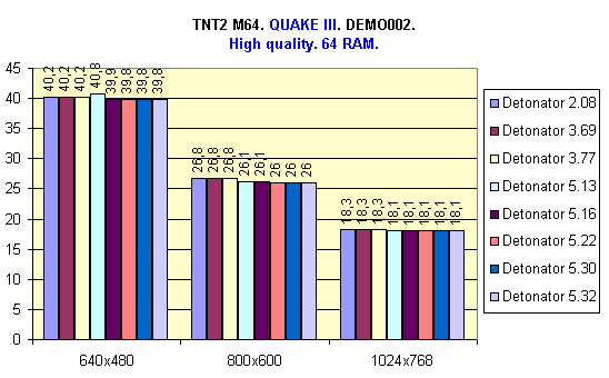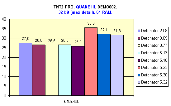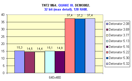В системе с 64 Мбайт ОЗУ лучшие результаты показали драйверы версий 5.22, 5.30 и 5.32, так как в них есть поддержка режима DiME, однако Detonator 5.22 показал чуть более лучший результат. Также хочу отметить тот факт, что в данном случае (64 Мбайт ОЗУ) большую роль играет скорость передачи данных с жесткого диска, т.к. происходит постоянный свопинг.
