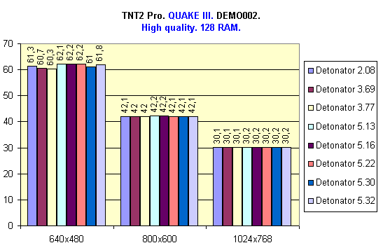 Результаты говорят сами за себя. Как видим, наибольшую скорость дает Detonator 2.08, причем во всех разрешениях. И это драйвер годичной давности! Остальные "участники" показали примерно одинаковые результаты.