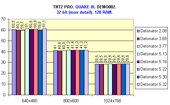 Теперь давайте посмотрим, как ведут себя драйверы на более мощной карточке, оснащенной (к тому же) бОльшим объемом локальной памяти (32 Мбайт). Я не буду приводить результаты тестов в игре Unreal Tournament, поскольку скорость Detonator`ов практически одинакова, за исключением опять небольшого опережения версии 2.08, к тому же разница между режимами 640х480х16bit и 1024х768х32bit не превышала 3 fps. Вот такая она, игра, Unreal Tournament :)