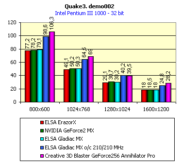 Этих инструментов вполне достаточно для того, чтобы показать производительность видеокарты при работе через два основных API. Для наглядности на диаграммах приведены скоростные показатели еще трех видеокарт: ELSA ErazorX (на базе NVIDIA GeForce256 SDR), reference card NVIDIA GeForce2 MX и Creative 3D Blaster GeForce256 Annihilator Pro (на базе NVIDIA GeForce256 DDR). Также мы покажем, как изменилась производительность видеокарты ELSA Gladiac MX в режиме разгона.