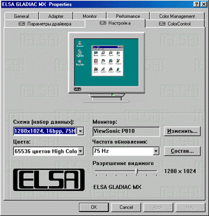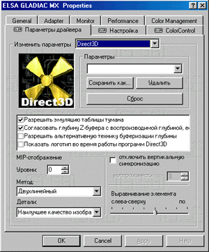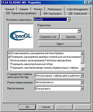 Компания ELSA поставляет с видеокартой драйверы своей собственной разработки, хотя они и базируются на эталонных от NVIDIA. Поэтому наличие несколько нестандартных настроек является основанием для рассмотрения этих драйверов более подробно. К сожалению, ELSA еще не выпустила драйверы на базе Detonator3-серии (версии 6.*), поэтому ряд функций GeForce2 MX (например, DVC) остались недоступными. Рассматриваемая версия базируется на reference driver 5.33.