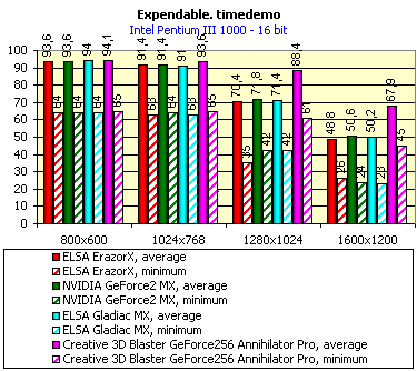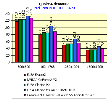 Начнем мы с 2D-графики. Я ранее уже отмечал хорошее качество и очень приличную скорость в 2D-графике, которые продемонстрировали карты на базе GeForce2 MX от NVIDIA. И вот теперь могу констатировать, что у карты ELSA Gladiac MX все показатели в 2D ничуть не хуже, чем у других плат этого класса (сказывается полное повторение эталонного дизайна от NVIDIA). Я констатирую факт: видеокарта ELSA Gladiac MX наряду с остальными представителями таких плат обеспечит потребности в качественном изображении абсолютного большинства пользователей.