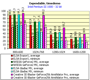 Нетрудно заметить, что показатели производительности видеокарты ELSA Gladiac MX в целом практически не отличаются от результатов эталонной карты на NVIDIA GeForce2 MX. Gladiac MX немного опережает конкурента на базе NVIDIA GeForce256 SDR и сильно отстает от платы на базе GeForce256 DDR. Такие результаты вполне прогнозируемы, учитывая неторопливую видеопамять. Даже разгон ELSA Gladiac MX не смог обеспечить этой плате победу в 32-битном цвете. А вот в 16-битном цвете работающая на разогнанных частотах ELSA Gladiac MX смогла обойти всех соперников. Отмечу, что карта от ELSA работала при минимальном внешнем дополнительном охлаждении (в системном блоке был установлен всего один дополнительный вентилятор для хорошей циркуляции воздуха). Разумеется, я не могу экстраполировать результаты разгона данной карты на все платы на базе GeForce2 MX, однако, есть все основания надеяться, что любители разгона смогут выбрать подходящий экземпляр для своих нужд.