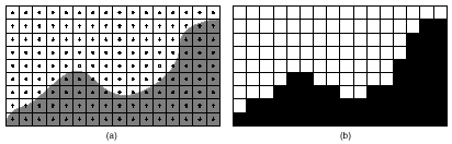 Для лучшего понимания эффекта ступенчатости ниже приведены два скриншота. В части 'a' рисунка 1 — пример того, что может случиться с краями полученного изображения, например, гор. Мы видим, что поверхность располагается на сетке, каждая секция которой представляет собой пиксель. Так как обычно строим изображение мы пополигонно (а в конечном итоге — попиксельно), мы заполняем или не заполняем каждый пиксель. Получается дискретная система, в которой не может быть частично заполненных пикселей. Выбор решения — заполнять или нет — зависит от местоположения центра пиксельной зоны (на рисунке зоны показаны маленькими кружками).