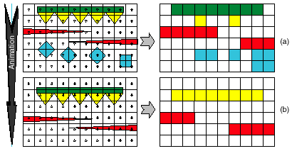 Рисунок 2 показывает различные эффекты исчезновения полигонов. Слева мы видим желаемый нами результат, а справа — рассчитанный результат, пострадавший от артефактов нежелательного исчезновения полигонов. Например, обратите внимание на зелёную полоску 'a'. Она закрывает центры пикселей (a) и поэтому видна. Но теперь представьте, что анимация пошла (вниз) и зелёная полоса оказалась в положении (b). В этом положении центры пикселей полосой не закрыты, поэтому, в итоге, фактически ничего и не рендерится. Заметьте, как легко зелёная полоса из видимой стала невидимой всего лишь после небольшого сдвига. Если сдвиг продолжить, то полоса снова закроет центры пикселей и станет полностью видимой. Начинается "мерцание" — прекрасный пример дискретного артефакта. К тому же, заметьте, как изменяются жёлтые фигуры от кадра (a) к (b). На разных кадрах они получились по-разному из-за недостатка отсчетов для точного представления модели. Красные продолговатые треугольники имеют совершенно одинаковые размеры, но они стали различаться в результате разного количества пикселей. Синий квадрат в кадре (a) показывает, как отличающийся от других полигон может перестать отличаться при его растеризации в изменённом месте и положении.