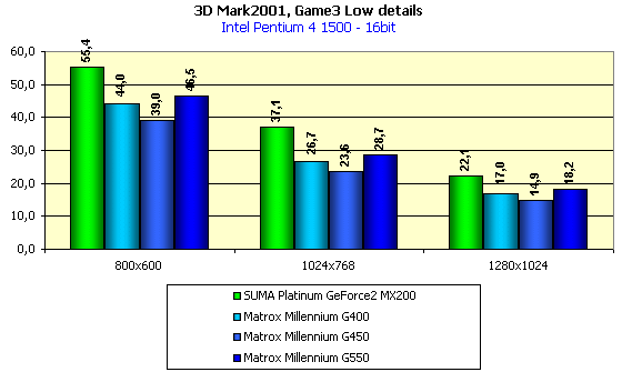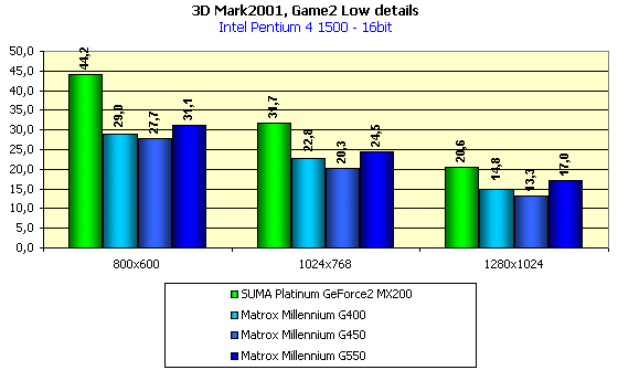 Мы видим, что картина чуть лучше, нежели в Quake3; Matrox Millennium G550 уже подчас обгоняет GeForce2 MX200 в 32-битном цвете (все же наличие DDR-памяти сказывается при равных с MX200 64-битных шинах). Тем не менее, превосходство минимально, и поэтому G550 можно смело относить по производительности к классу MX200/TNT2Pro/G400. То, что у G550 есть Hardware T&L, ни одна программа не видит (Matrox так хорошо "запрятала" этот блок :-), не обеспечив ему совершенно никакой поддержки в текущей версии драйверов).