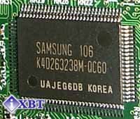 Микросхемы памяти марки Samsung, время выборки — 6 ns, что соответствует 166 (333) МГц. На этой частоте память и функционирует. Почему такое необычно малое число микросхем? Первопричина в том, что сейчас на рынке много серийно выпускаемых 32-битных модулей большой емкости (16 мегабайт), а для организации 64-битной шины достаточно всего 2-х таких микросхем. Конечно, если помечтать и предположить, что на обороте карты есть еще две таких же микросхемы, то кроме 64-х мегабайт ОЗУ мы имели бы, прежде всего, 128-битную шину обмена с DDR-памятью! Да, графический процессор не рассчитан на такую шину, да и разводка платы... Но это же просто мечты. Тогда и скорость в 3D была бы... Впрочем, мы уже забегаем вперед.