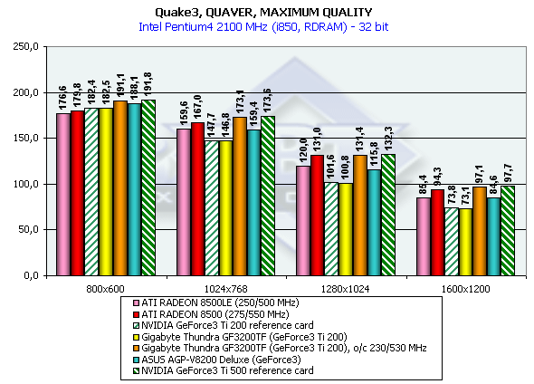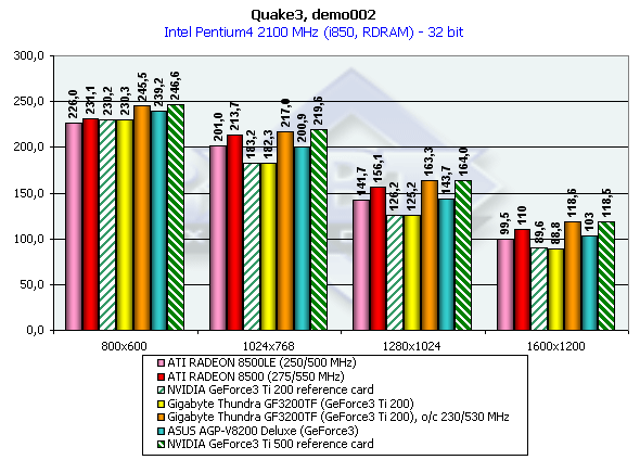 Как мы видим, Gigabyte Thundra GeForce3 Ti 200 продемонстрировала полную идентичность по производительности с reference-картой (что и должно быть), а при разгоне достигла скорости Ti 500 (то, что чип на 10 МГц не дотянул до Ti 500 было компенсировано повышением частоты памяти до 265 (530) МГц). На своих штатных частотах карта отстает от ATI RADEON 8500 LE и RADEON 8500.