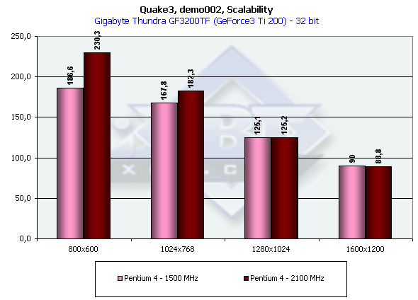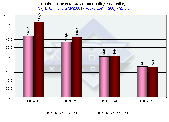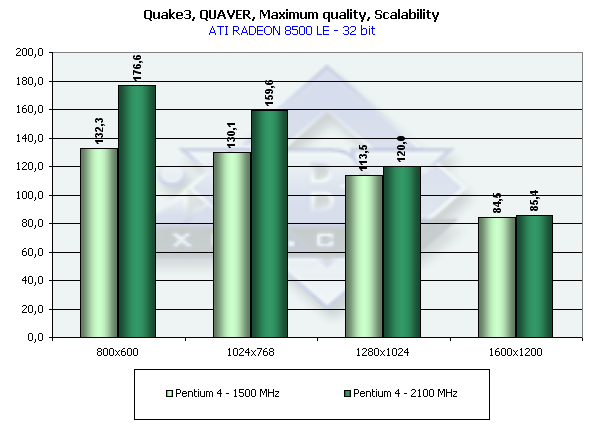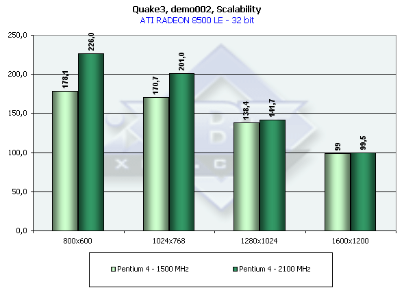 Хорошо видно, что обе карты достаточно отзывчивы на повышение частоты работы процессора в разрешениях до 1280х1024 (речь идет о 32-битном цвете). А RADEON 8500 LE и в 1280х1024 дает небольшой прирост производительности при увеличении частоты CPU.