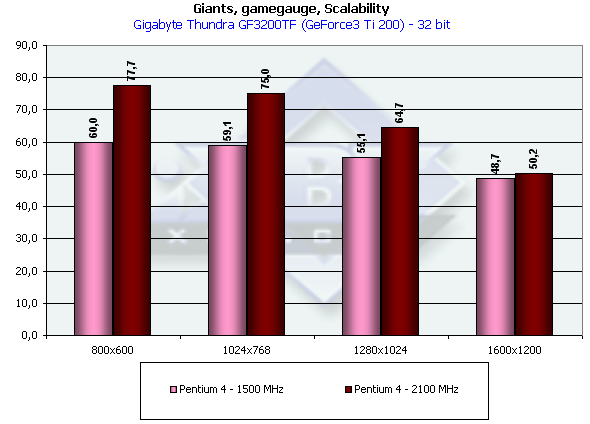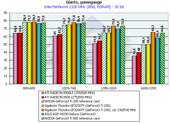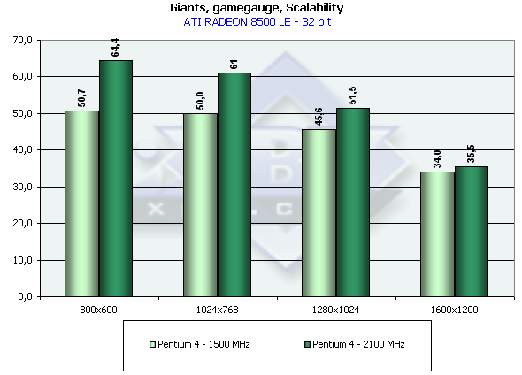 Несмотря на общую более низкую производительность у RADEON 8500, чем у GeForce3 Ti 200, все равно реакция у первого на повыщение частоты работы CPU более яркая, нежели у второго. Впрочем, Giants вообще "любит" большие мощности процессоров.