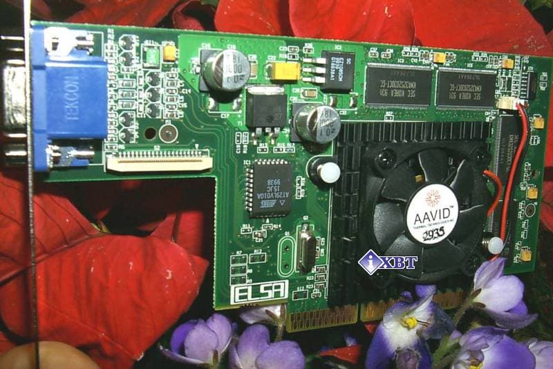 Плата с интерфейсом AGP 2x/4x, имеет на борту 32 мегабайта SDRAM (SDR) 6 ns памяти, размещенной в 4-х 64-мегабитных модулях. Как можно видеть, дизайн этой карты существенно отличается от рассмотренных ранее плат, имеющих SDR-память. Карточка выглядит очень компактной, имея при этом радиатор очень большого размера, на котором установлен вентилятор. Плата не имеет никаких дополнительных функций, к которым уже привыкли некоторые пользователи (ТВ-выход, вывод сигнала на LCD-монитор), однако можно заметить наличие на печатной плате нестандартного разъема белого цвета. Вероятно, ELSA собирается выпускать какие-то дочерние платы (вроде Rainbow Runner Studio от Matrox), которые будут функционировать только совместно с ELSA Erazor X и им подобными. Ни в документации, ни на сайте ELSA я не нашел описания предназначения этого разъема.