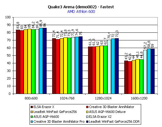 Итог по Quake3: среди плат с SDR-памятью лидируют обе карты от ASUS, а среди плат с DDR-памятью — Leadtek WinFast GeForce 256 DDR. Почти везде аутсайдером является ELSA Erazor X.