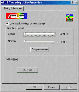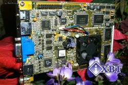 На карте установлены модули памяти от SEC, рассчитанные на 200 МГц, но тактуемые на 166 МГц. Разгон, к сожалению, выше 205 МГц по памяти невозможен, да и чипсет попался, сильно перегревающийся, поэтому максимум, что удалось достичь на данном экземпляре по частотам — 130/200 МГц.