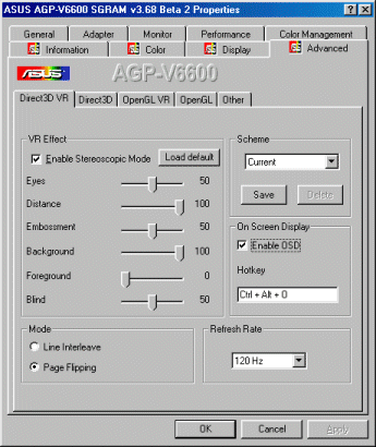 При установке последней версии драйверов от ASUS v.3.66 beta2 в настройках стерео-очков есть присутствуют две закладки: Direct3D и OpenGL, поскольку эти очки позволяют получать стерео-эффект в обоих этих API. Конструкция очков схожа с описываемыми нами ранее очками от ELSA — Revelator 3D. То есть, линзы очков попеременно закрываются с частотой 60,70 или 75 Гц, а на экране монитора с той же частотой чередуются картинки для левого и правого глаза: