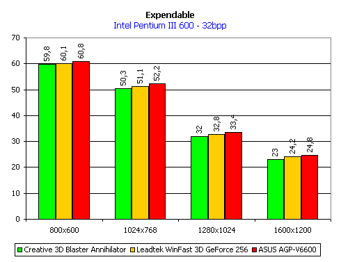 Легко заметить, что картина почти во всех разрешениях — однородная: ASUS AGP-V6600 является лидером, почти на равных с ним — Leadtek WinFast GeForce 256, а Creative 3D Blaster Annihilator несколько отстал.