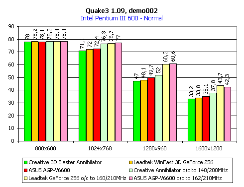 В данном тестировании также снимались показания на штатных частотах и при разгоне. Результат очевиден: по всем позициям лидирует ASUS AGP-V6600, близко к нему находится Leadtek WinFast GeForce 256. Интересно отметить, что с ростом разрешения разрыв в результатах между разными видеокартами увеличивается. Различие в скоростях между работающими на номинальных и разогнанных частотах видеокартами достигает своего максимума на самом высоком разрешении — 1600х1200.